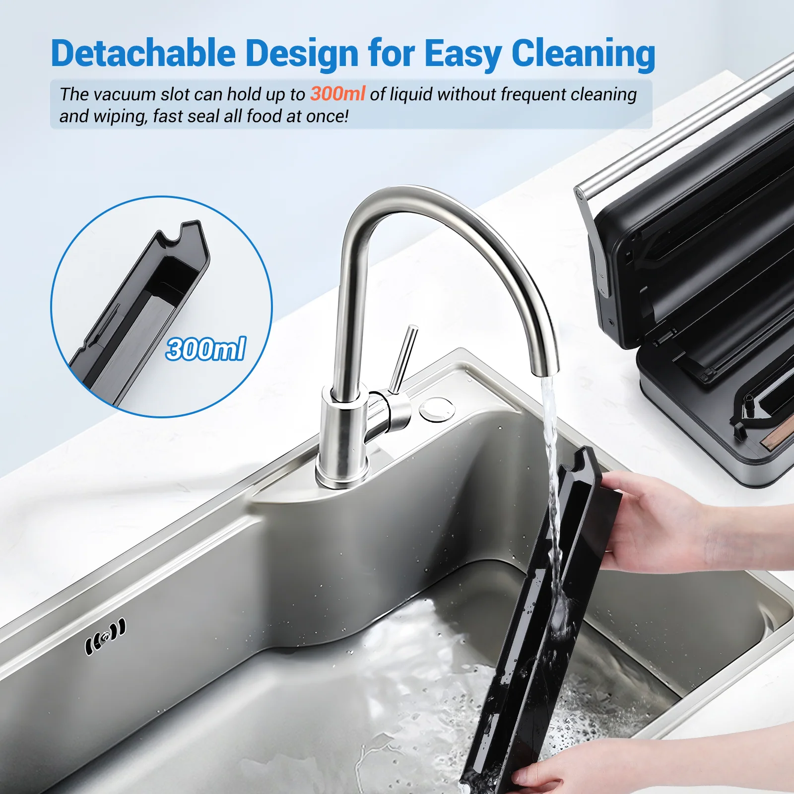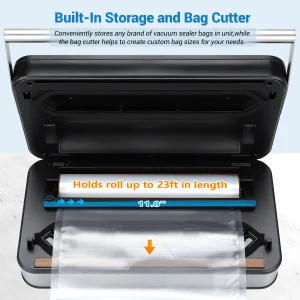 Sisemine kotihoidik mahutab kotirulli suurusega 11” * 16,4′ / 28 * 500 cm. Sisseehitatud lõikuri abil saate kohandada erineva suurusega kotikesi vastavalt toiduainete suurusele. Enam pole kotijäätmeid. Vesiste toitude vaakumpakendamisel hoiab tihendusriba lähedal asuv tilgaalus imatud vee kinni, takistades vee sattumist masinasse. Tilgaalus on eemaldatav, nii et saate vee hõlpsalt eemaldada ja alust puhastada.