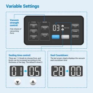 Loendusnäidik + ülekuumenemiskaitse: See vaakumpakendaja on lihtsalt ühendatav, hõlpsasti mõistetav ja kasutatav. Juhtpaneelil olev LED-ekraan näitab vaakumprotsessi loendurit reaalajas, muutes toimingu edenemise nähtavaks. Lisaks on see spetsiaalselt loodud ülekuumenemiskaitsesüsteemiga, mis tagab masina stabiilse oleku pika kasutusaja jooksul, muutes iga kasutuskorra ohutuks.